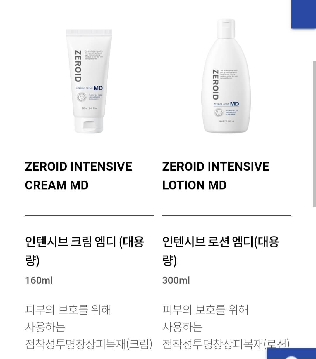 제로이드 로션은 300ml용량으로 56,000원에 판매하고 있습니다. 그리고 제로이드 크림은 160ml용량으로 60,000원에 판매하고 있습니다.